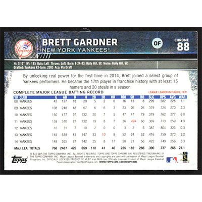 This is a 2015 Topps Chrome Refractors Brett Gardner baseball card. The card is #88 and pictures show condition.