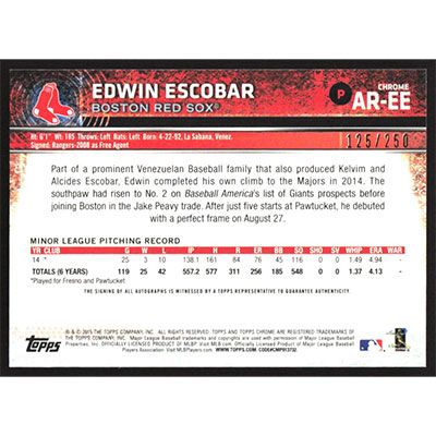 This is a 2015 Topps Chrome Rookie Autographs Purple Refractors Edwin Escobar autographed baseball card. This card has been signed, in blue, by Edwin Escobar, and is and is certified authentic by Topps. The card is #AR-EE and pictures show condition. This card is limited; #'d 125/250.