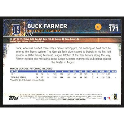 This is a 2015 Topps Chrome Sepia Refractors Buck Farmer baseball card. The card is #171 and pictures show condition. Team(s): Detroit Tigers Rookie Card (RC)