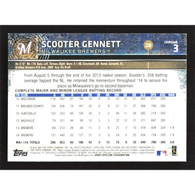 This is a 2015 Topps Chrome Sepia Refractors Scooter Gennett baseball card. The card is #3 and pictures show condition.