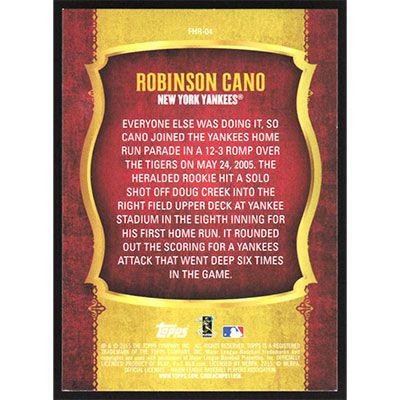 This is a 2015 Topps First Home Run Robinson Cano baseball card. The card is #FHR-04 and pictures show condition.