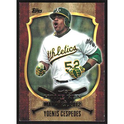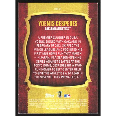 This is a 2015 Topps First Home Run Gold Yoenis Cespedes baseball card. The card is #FHR-31 and pictures show condition.