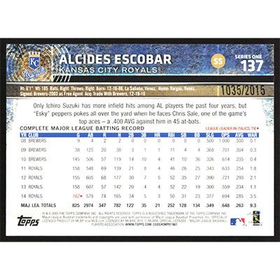 This is a 2015 Topps Gold Alcides Escobar baseball card. The card is #137 and pictures show condition. This card is limited; #'d 1035/2015. Team(s): Kansas City Royals