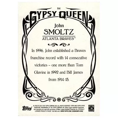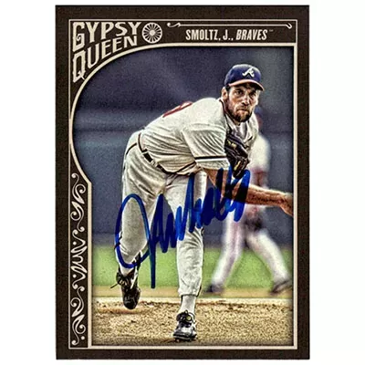 This is a 2015 Topps Gypsy Queen John Smoltz autographed baseball card.This card is signed, in blue, by John Smoltz, and is guaranteed authentic by Ballcardz.com. The card is #84 and is in NM-MT condition.