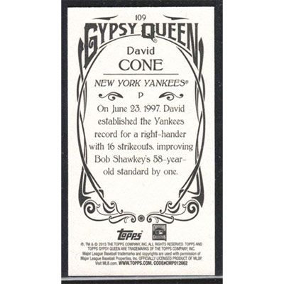 This is a 2015 Topps Gypsy Queen Mini David Cone baseball card. The card is #109 and pictures show condition.
