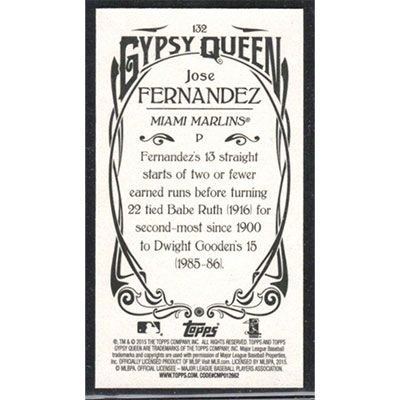 This is a 2015 Topps Gypsy Queen Mini Jose Fernandez baseball card. The card is #132 and pictures show condition.