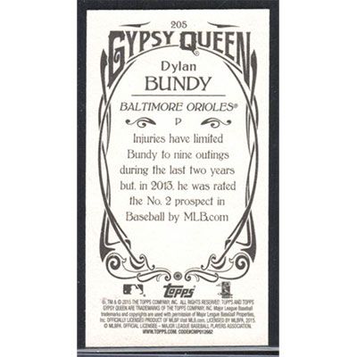 This is a 2015 Topps Gypsy Queen Mini Dylan Bundy baseball card. The card is #205 and pictures show condition.