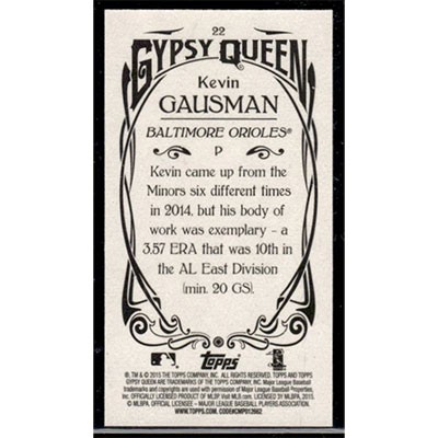 This is a 2015 Topps Gypsy Queen Mini Kevin Gausman baseball card. The card is #22 and pictures show condition.