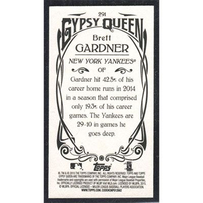 This is a 2015 Topps Gypsy Queen Mini Brett Gardner baseball card. The card is #291 and pictures show condition.