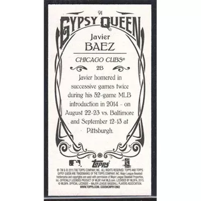 This is a 2015 Topps Gypsy Queen Mini Javier Baez baseball card. The card is #91 and pictures show condition.