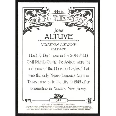 This is a 2015 Topps Gypsy Queen The Queen's Throwbacks Jose Altuve baseball card. The card is #QT-11 and pictures show condition. Team(s): Houston Astros