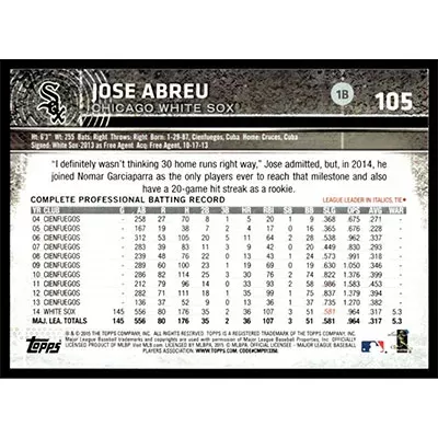 This is a 2015 Topps Opening Day Jose Abreu baseball card. The card is #105 and pictures show condition.