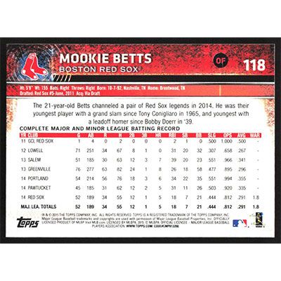 This is a 2015 Topps Opening Day Mookie Betts baseball card. The card is #118 and pictures show condition.