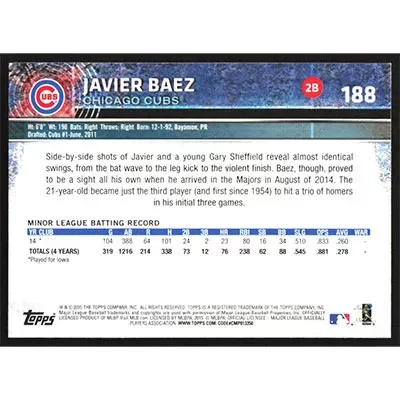 This is a 2015 Topps Opening Day Javier Baez baseball card. The card is #188 and pictures show condition.