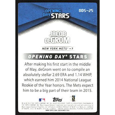 This is a 2015 Topps Opening Day Stars Jacob deGrom baseball card. The card is #ODS-25 and pictures show condition.