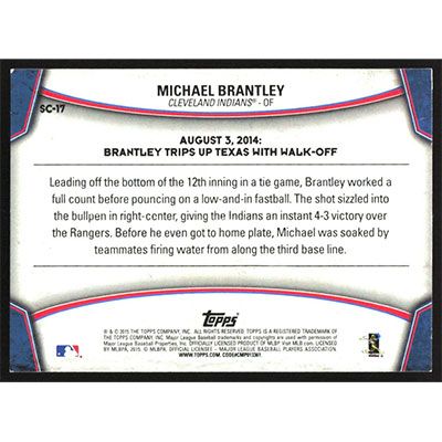 This is a 2015 Topps Opening Day Superstar Celebrations Michael Brantley baseball card. The card is #SC-17 and pictures show condition. Team(s): Cleveland Indians