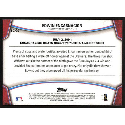 This is a 2015 Topps Opening Day Superstar Celebrations Edwin Encarnacion baseball card. The card is #SC-20 and pictures show condition. Team(s): Toronto Blue Jays