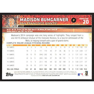 This is a 2015 Topps Rainbow Foil Madison Bumgarner baseball card. The card is #20 and pictures show condition.