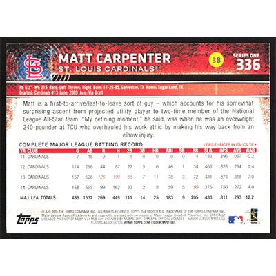 This is a 2015 Topps Rainbow Foil Matt Carpenter baseball card. The card is #336 and pictures show condition.