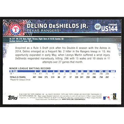 This is a 2015 Topps Update Chrome Delino DeShields Jr. baseball card. The card is #US144 and pictures show condition. Team(s): Texas Rangers Rookie Card (RC)