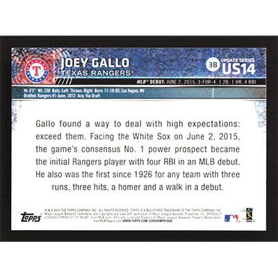 This is a 2015 Topps Update Joey Gallo Rookie Debut baseball card. The card is #US14 and pictures show condition. Team(s): Texas Rangers Rookie Card (RC)