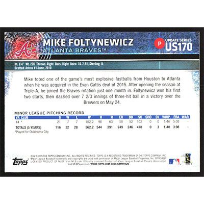 This is a 2015 Topps Update Mike Foltynewicz autographed baseball card. This card has been signed, in blue, by Mike Foltynewicz, and is guaranteed authentic by Ballcardz.com. The card is #US170 and pictures show condition.