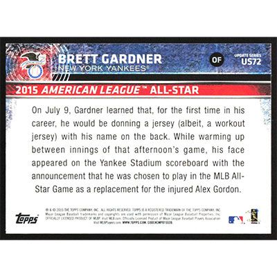 This is a 2015 Topps Update Brett Gardner All-Star baseball card. The card is #US72 and pictures show condition.
