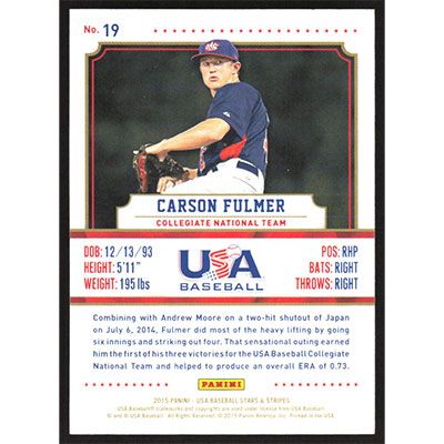 This is a 2015 USA Baseball Stars & Stripes Carson Fulmer autographed baseball card. This card has been signed, in blue, by Carson Fulmer, and is guaranteed authentic by Ballcardz.com. The card is #19 and pictures show condition.