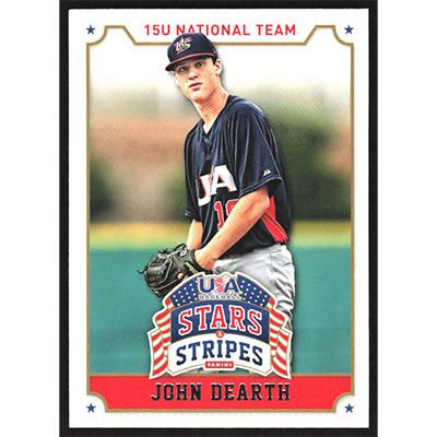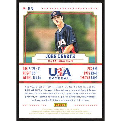 This is a 2015 USA Baseball Stars & Stripes John Dearth baseball card. The card is #53 and pictures show condition.
