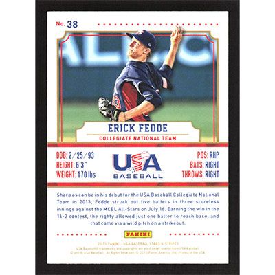 This is a 2015 USA Baseball Stars & Stripes Longevity Erick Fedde autographed baseball card. This card has been signed, in blue, by Erick Fedde, and is guaranteed authentic by Ballcardz.com. The card is #38 and pictures show condition.