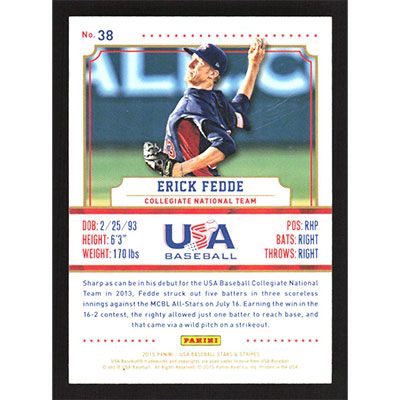 This is a 2015 USA Baseball Stars & Stripes Longevity Retail Gold Erick Fedde autographed baseball card. This card has been signed, in blue, by Erick Fedde, and is guaranteed authentic by Ballcardz.com. The card is #38 and pictures show condition.