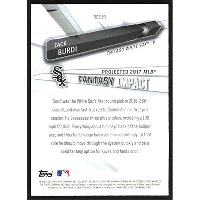 This is a 2016 Bowman Chrome Draft Scouts Fantasy Impacts Zack Burdi autographed baseball card. This card has been signed, in blue, by Zack Burdi, and is guaranteed authentic by Ballcardz.com. The card is #BSI-ZB and pictures show condition.