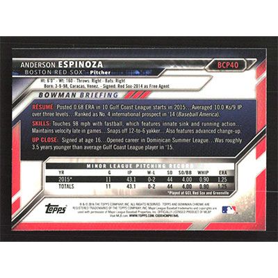This is a 2016 Bowman Chrome Prospects Anderson Espinoza baseball card. The card is #BCP40 and pictures show condition.