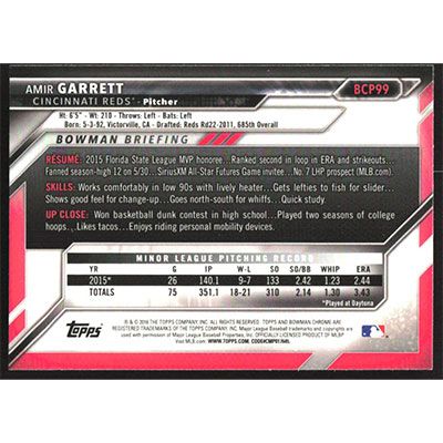 This is a 2016 Bowman Chrome Prospects Amir Garrett baseball card. The card is #BCP99 and pictures show condition.