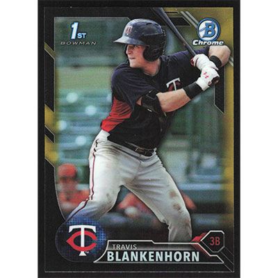 This is a 2016 Bowman Chrome Prospects Black and Gold Refractors Travis Blankenhorn baseball card. The card is #BCP185 and pictures show condition. Team(s): Minnesota Twins