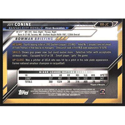 This is a 2016 Bowman Chrome Rookie Recollections Jeff Conine baseball card. The card is #RR-JC and pictures show condition. Team(s): Kansas City Royals
