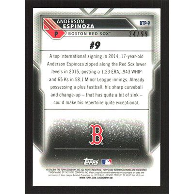 This is a 2016 Bowman Chrome Scouts Top 100 Green Refractors Anderson Espinoza baseball card. The card is #BTP-9 and pictures show condition. This card is limited; #'d 24/99.