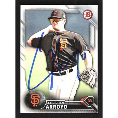 This is a 2016 Bowman Draft Christian Arroyo autographed baseball card. This card has been signed, in blue, by Christian Arroyo, and is guaranteed authentic by Ballcardz.com. The card is #BD-126 and pictures show condition.