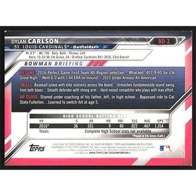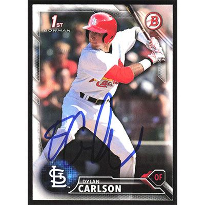This is a 2016 Bowman Draft Dylan Carlson autographed baseball card. This card has been signed, in blue, by Dylan Carlson, and is guaranteed authentic by Ballcardz.com. The card is #BD-3 and pictures show condition.