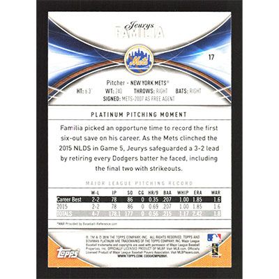 This is a 2016 Bowman Platinum Jeurys Familia baseball card. The card is #17 and pictures show condition.