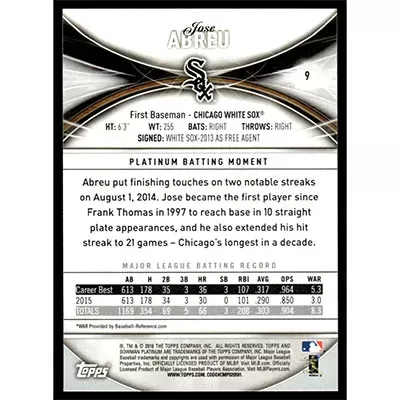 This is a 2016 Bowman Platinum Jose Abreu baseball card. The card is #9 and pictures show condition.