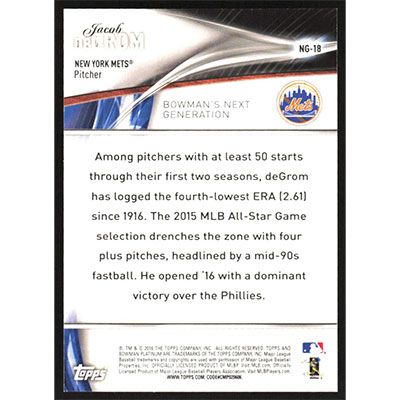 This is a 2016 Bowman Platinum Next Generation Jacob deGrom baseball card. The card is #NG-18 and pictures show condition.
