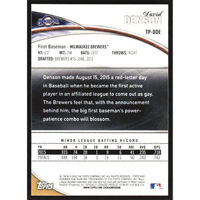 This is a 2016 Bowman Platinum Top Prospects David Denson baseball card. The card is #TP-DDE and pictures show condition.