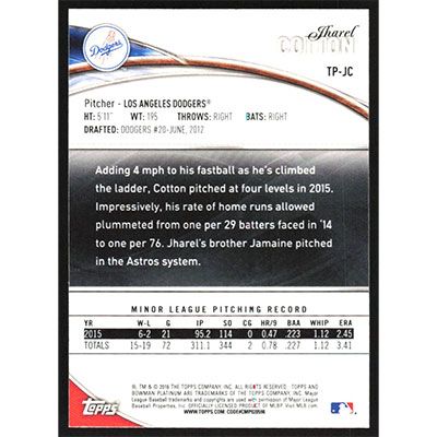 This is a 2016 Bowman Platinum Top Prospects Jharel Cotton baseball card. The card is #TP-JC and pictures show condition.