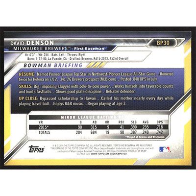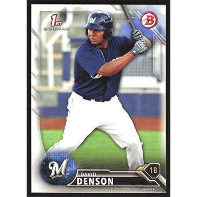 This is a 2016 Bowman Prospects David Denson baseball card. The card is #BP30 and pictures show condition.