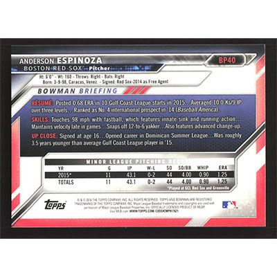 This is a 2016 Bowman Prospects Anderson Espinoza baseball card. The card is #BP40 and pictures show condition.