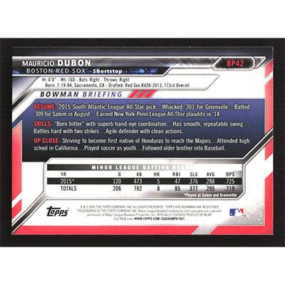 This is a 2016 Bowman Prospects Mauricio Dubon baseball card. The card is #BP42 and pictures show condition.