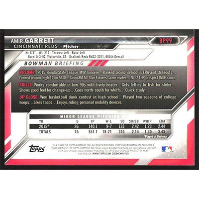 This is a 2016 Bowman Prospects Amir Garrett baseball card. The card is #BP99 and pictures show condition.