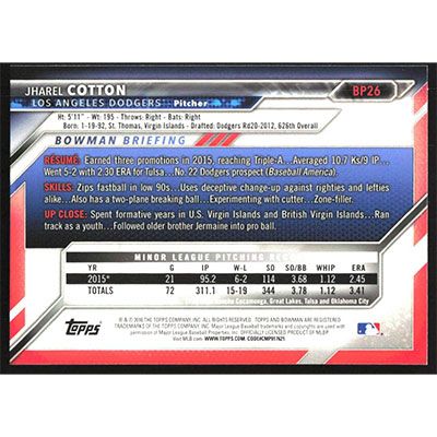 This is a 2016 Bowman Prospects Yellow Jharel Cotton baseball card. The card is #BP26 and pictures show condition.