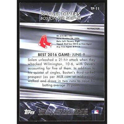 This is a 2016 Bowman's Best Top Prospects Refractors Rafael Devers baseball card. The card is #TP-11 and pictures show condition. Team(s): Boston Red Sox